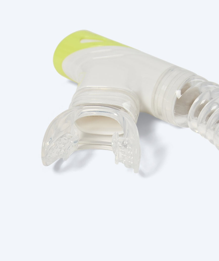 Silikonmunstycket är tillverkat av högkvalitativ silikon med ett bekvämt bett, särskilt anpassat för barn mellan 6 och 14 år. Det kan också tas av helt och antingen bytas ut eller bara rengöras, och sedan sättas på igen. Tillsammans säkerställer det att samma snorkel kan användas i flera år - utan att behöva bytas ut. Munstycket är självklart livsmedelsgodkänt.