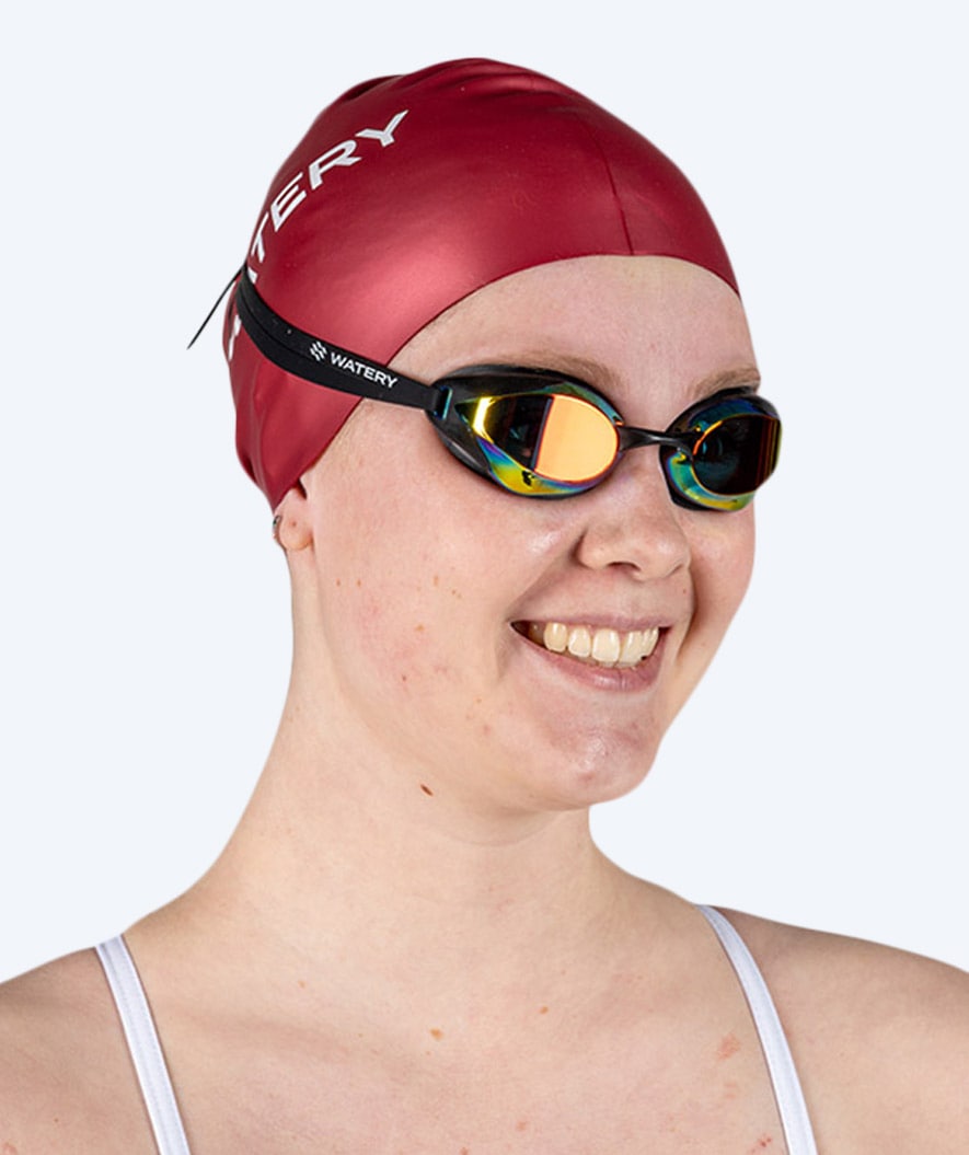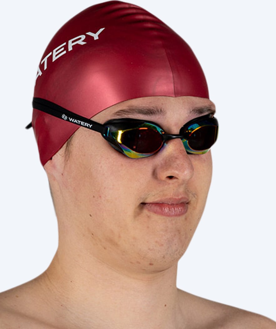 Förutom färgen i Bordeaux, finns Watery Signature Badmössan även i Vit, Gul, Orange, Röd, Svart, Brons, Rosa, Grön, Ljusblå, Royalblå, Mörkblå, Lila, Silver och Guld. Dessutom i de speciellt utvecklade färgerna för öppet vattensimning, där synlighet är det viktigaste, i form av Fluo-gul och Fluo-grön.